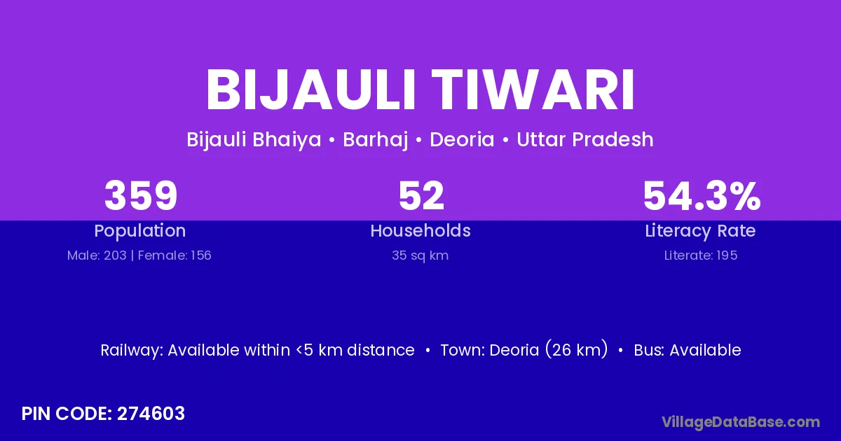 Bijauli Tiwari village has a total population of 359 people, of which 203 are males and 156 are females.