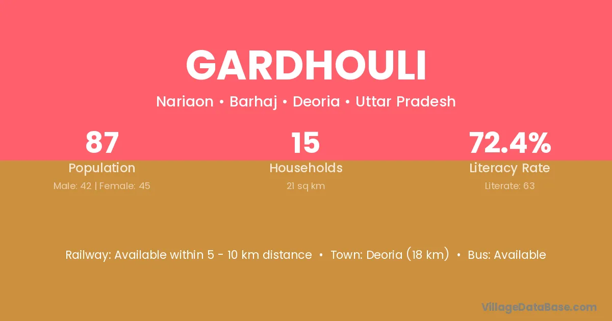 Deoria (18 km) is the nearest town to Gardhouli village for major economic activities and is located approximately 18 km away.