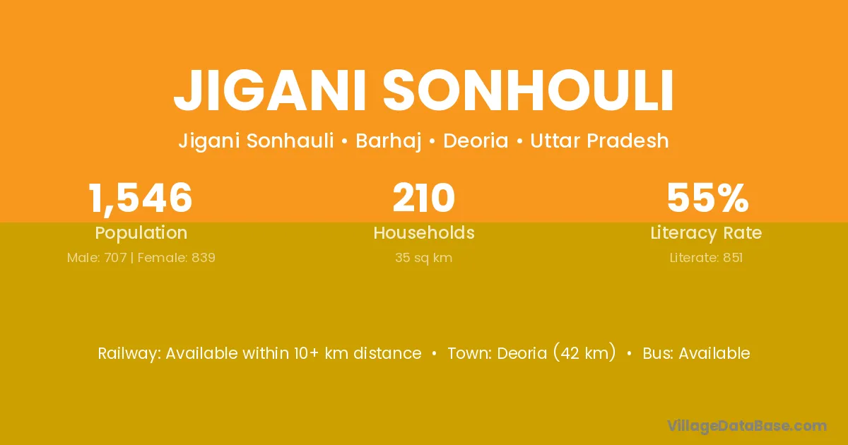 Deoria (42 km) is the nearest town to Jigani Sonhouli village for major economic activities and is located approximately 42 km away.