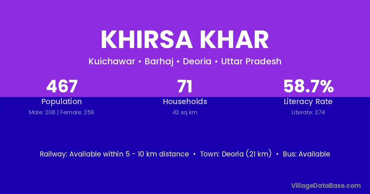 Deoria (21 km) is the nearest town to Khirsa Khar village for major economic activities and is located approximately 21 km away.