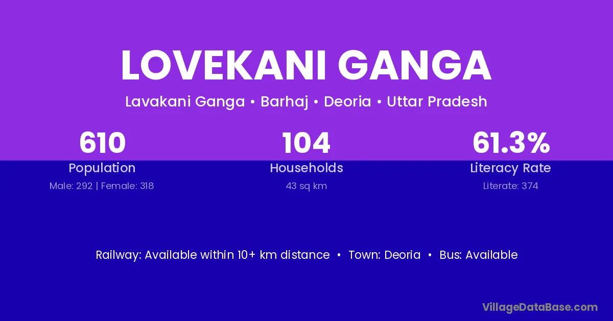 Lovekani Ganga village has a total population of 610 people, of which 292 are males and 318 are females.