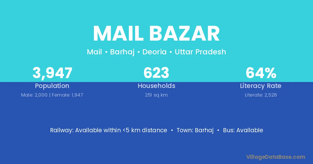 Mail Bazar village has a total population of 3,947 people, of which 2,000 are males and 1,947 are females.