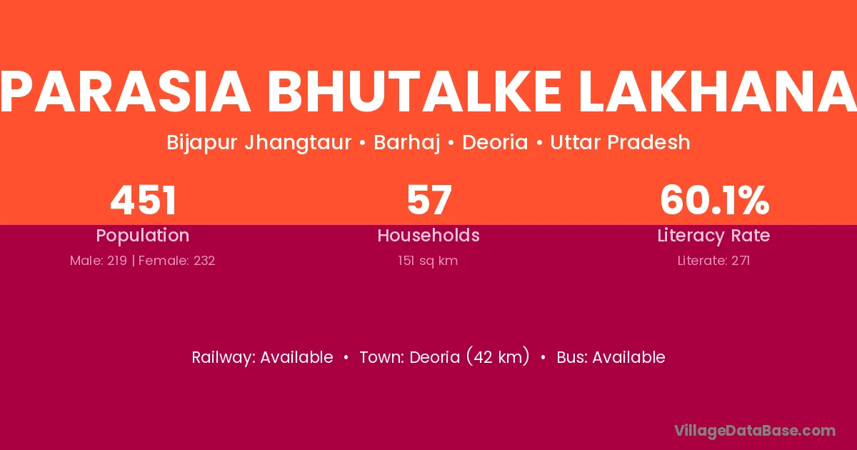 Parasia Bhutalke Lakhana village has a total population of 451 people, of which 219 are males and 232 are females.