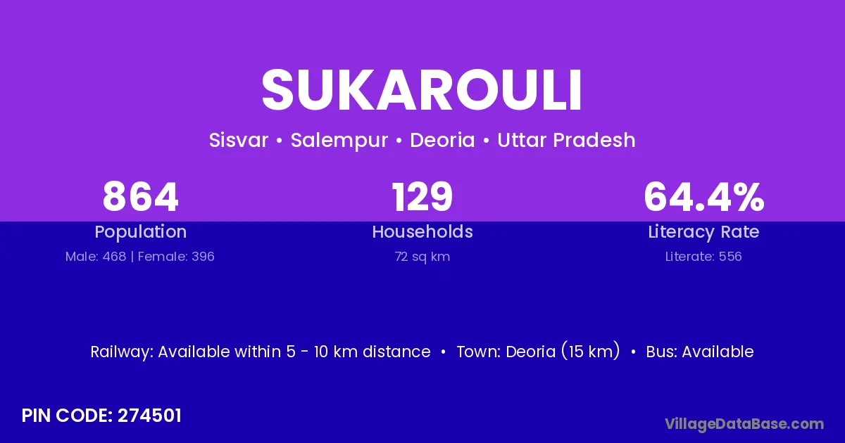 Sukarouli village has a total population of 1,724 people, of which 857 are males and 867 are females.