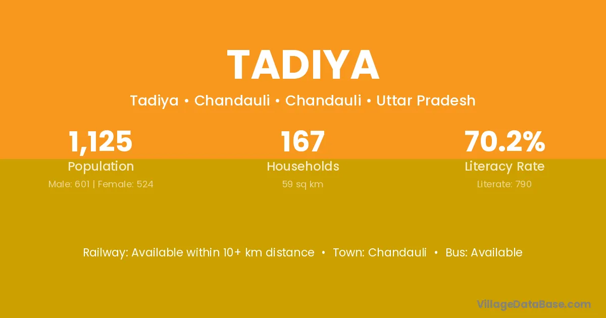 Deoria (5 km) is the nearest town to Tadiya village for major economic activities and is located approximately 5 km away.