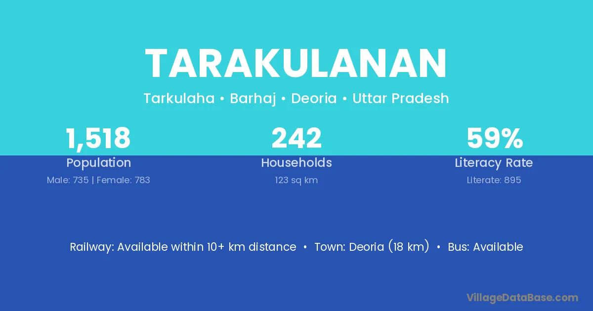 Deoria (18 km) is the nearest town to Tarakulanan village for major economic activities and is located approximately 18 km away.