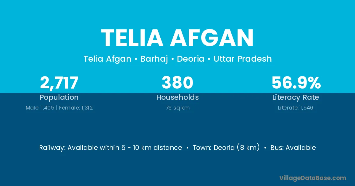 Deoria (8 km) is the nearest town to Telia Afgan village for major economic activities and is located approximately 8 km away.