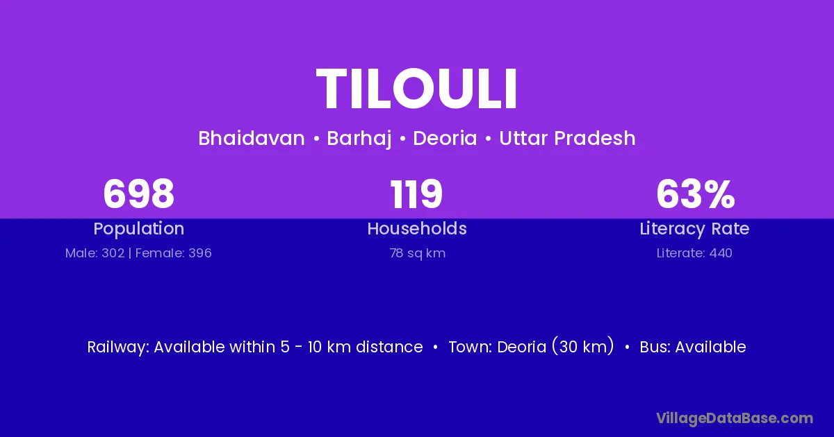 Deoria (30 km) is the nearest town to Tilouli village for major economic activities and is located approximately 30 km away.
