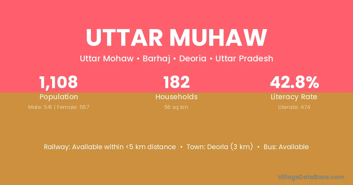 Uttar Muhaw village has a total population of 1,108 people, of which 541 are males and 567 are females.