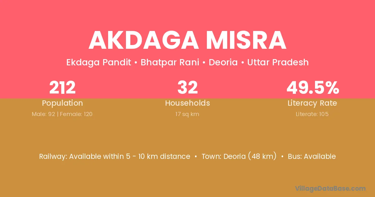 Deoria (48 km) is the nearest town to Akdaga Misra village for major economic activities and is located approximately 48 km away.