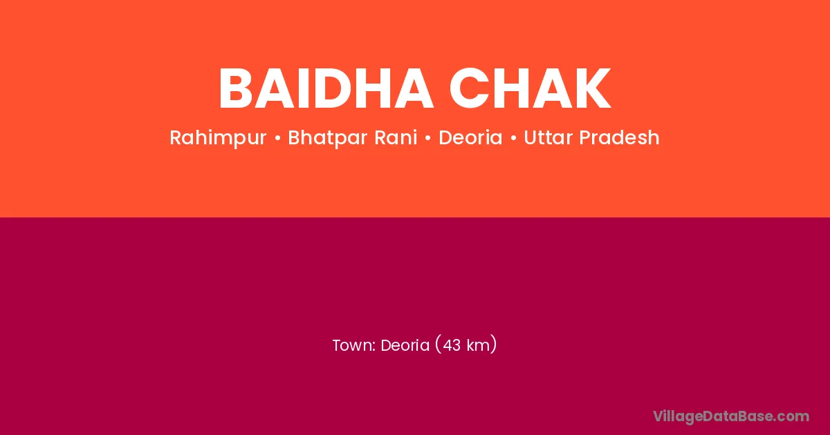 Deoria (43 km) is the nearest town to Baidha Chak village for major economic activities and is located approximately 43 km away.