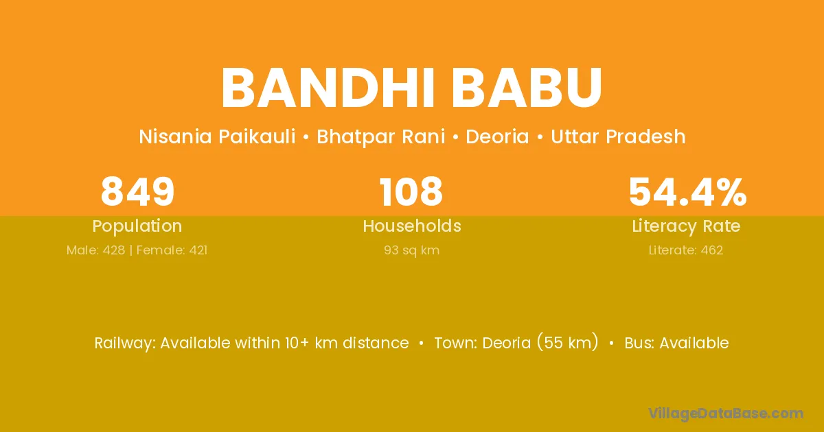 Deoria (55 km) is the nearest town to Bandhi Babu village for major economic activities and is located approximately 55 km away.