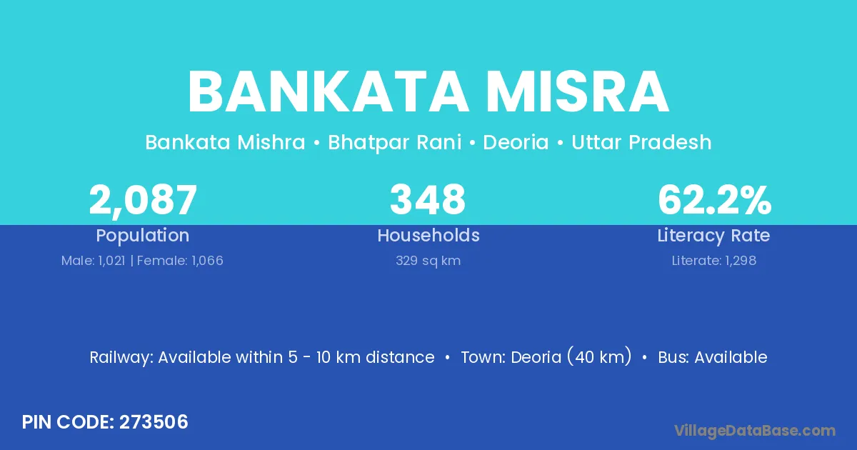 Deoria (40 km) is the nearest town to Bankata Misra village for major economic activities and is located approximately 40 km away.