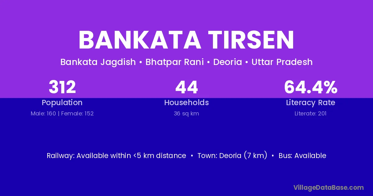 Deoria (7 km) is the nearest town to Bankata Tirsen village for major economic activities and is located approximately 7 km away.