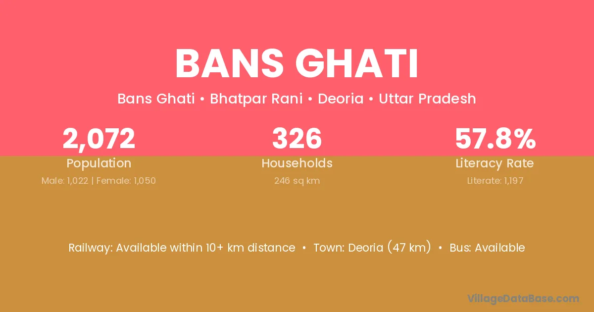 Deoria (47 km) is the nearest town to Bans Ghati village for major economic activities and is located approximately 47 km away.