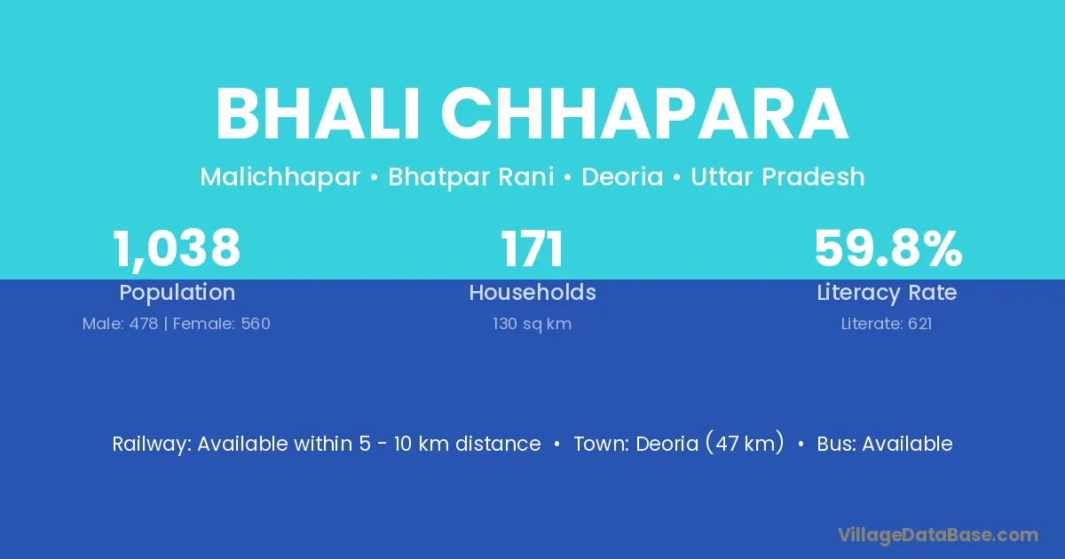 Deoria (47 km) is the nearest town to Bhali Chhapara village for major economic activities and is located approximately 47 km away.