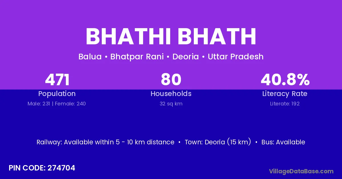 Deoria (15 km) is the nearest town to Bhathi Bhath village for major economic activities and is located approximately 15 km away.