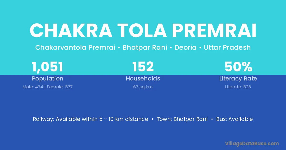 Chakra Tola Premrai village has a total population of 1,051 people, of which 474 are males and 577 are females.
