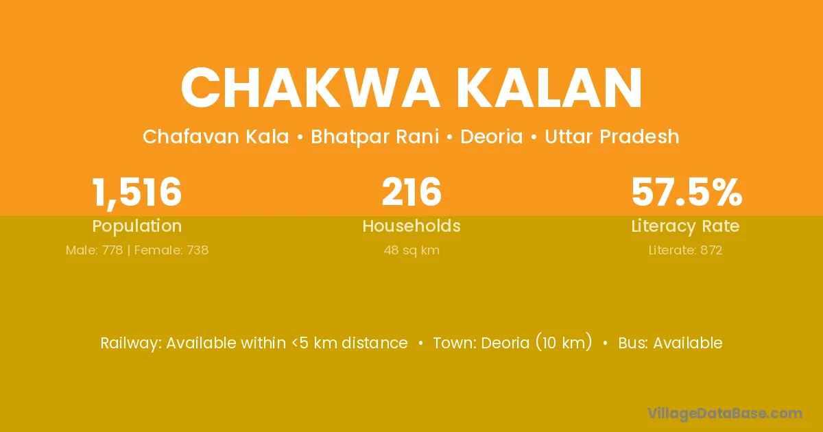 Deoria (10 km) is the nearest town to Chakwa Kalan village for major economic activities and is located approximately 10 km away.