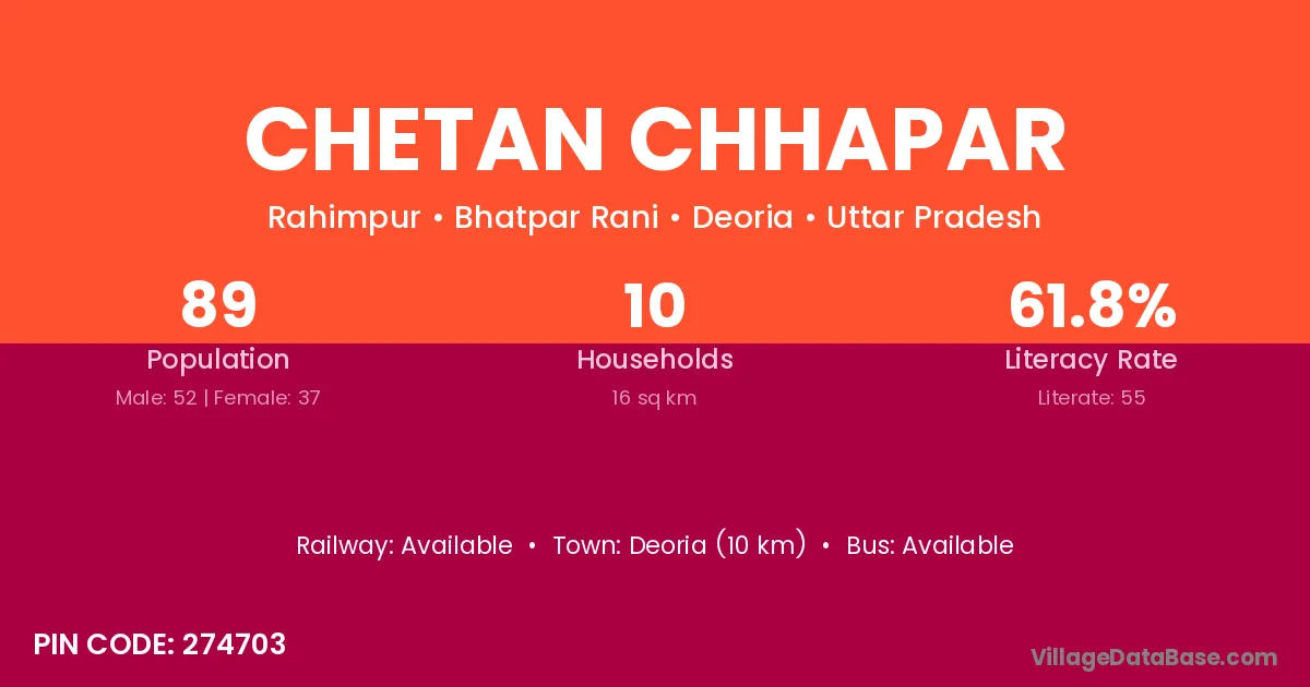 Deoria (10 km) is the nearest town to Chetan Chhapar village for major economic activities and is located approximately 10 km away.