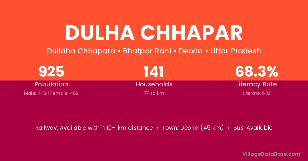 Deoria (45 km) is the nearest town to Dulha Chhapar village for major economic activities and is located approximately 45 km away.