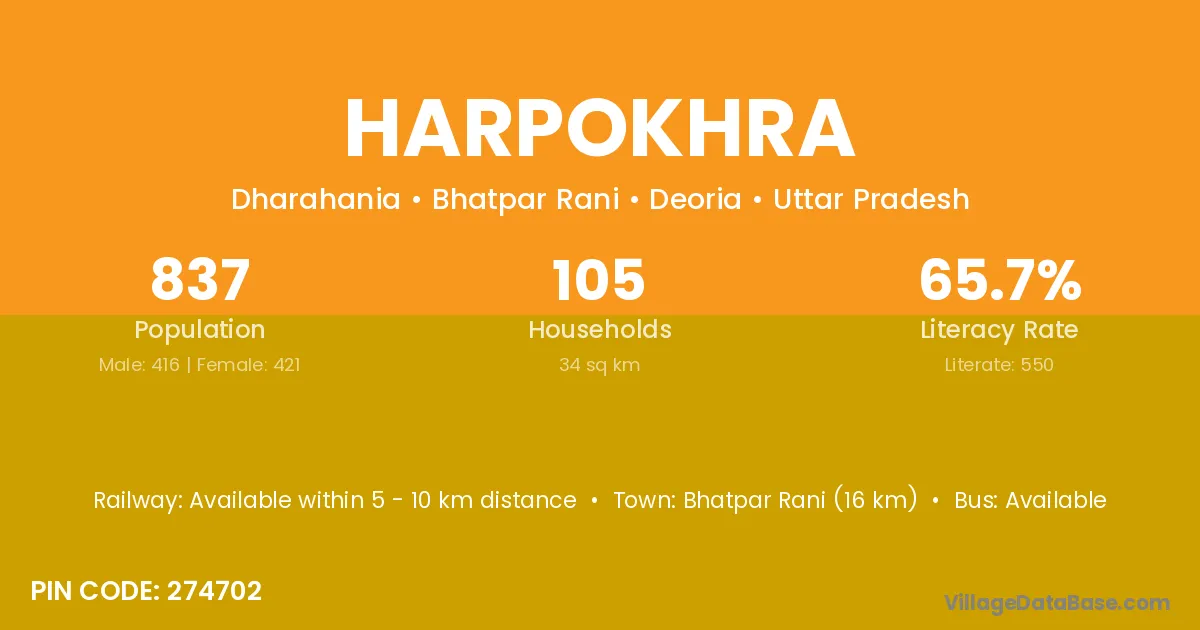 Bhatpar Rani (16 km) is the nearest town to Harpokhra village for major economic activities and is located approximately 16 km away.