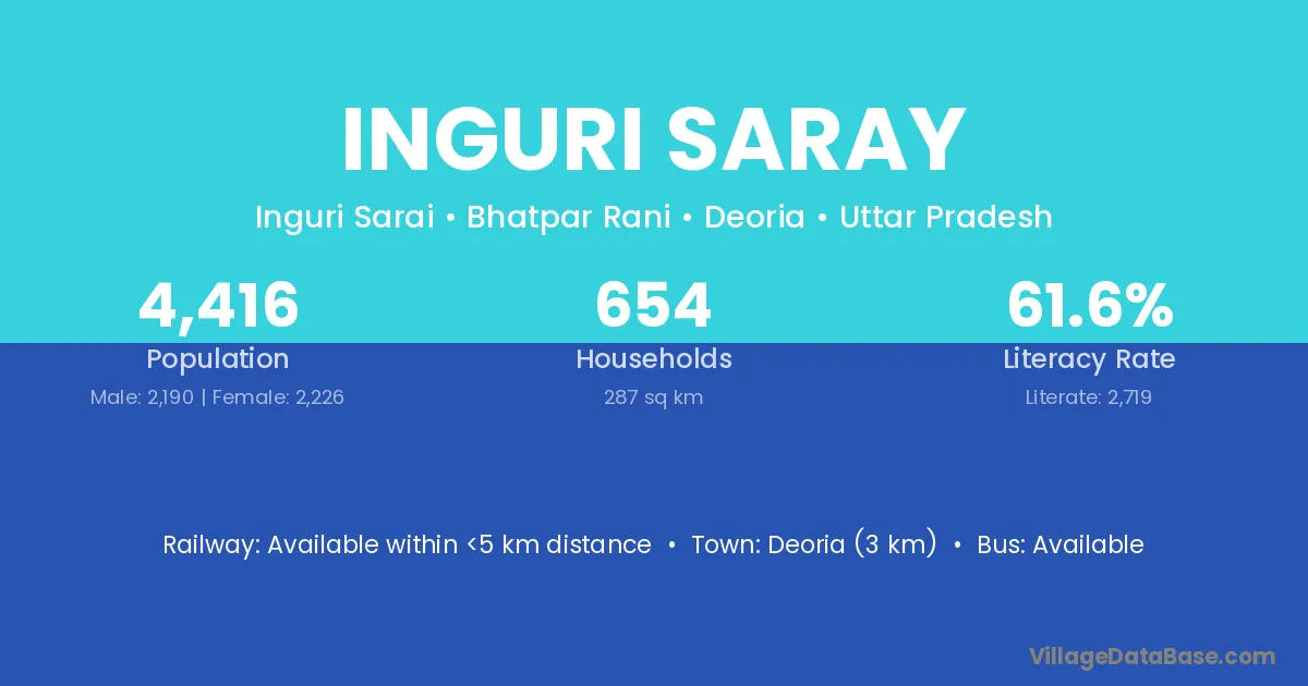 Deoria (3 km) is the nearest town to Inguri Saray village for major economic activities and is located approximately 3 km away.
