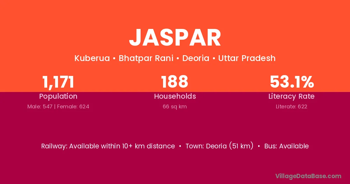Deoria (51 km) is the nearest town to Jaspar village for major economic activities and is located approximately 51 km away.