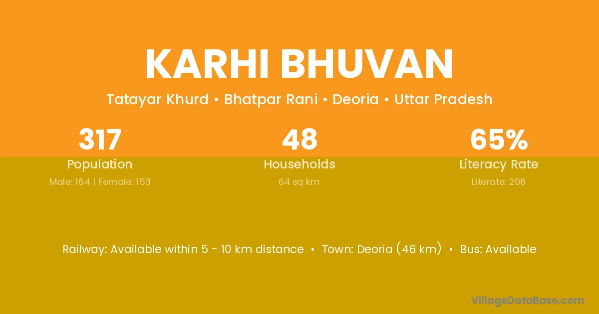 Deoria (46 km) is the nearest town to Karhi Bhuvan village for major economic activities and is located approximately 46 km away.
