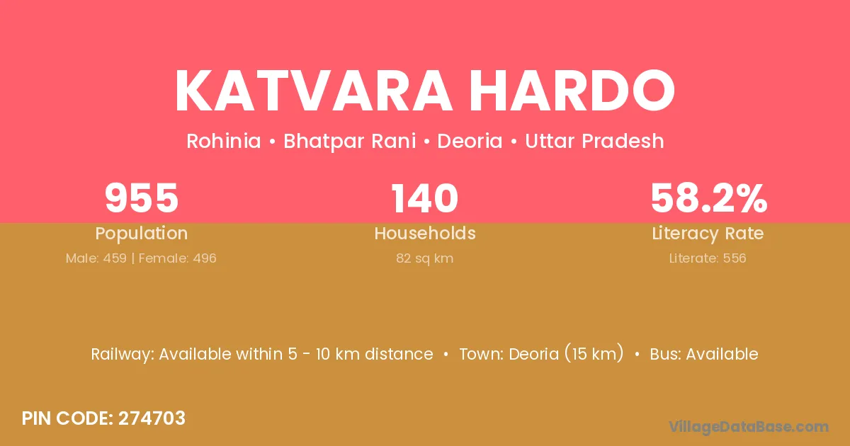 Deoria (15 km) is the nearest town to Katvara Hardo village for major economic activities and is located approximately 15 km away.