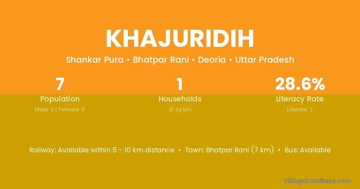 Khajuridih village has a total population of 7 people, of which 2 are males and 5 are females.
