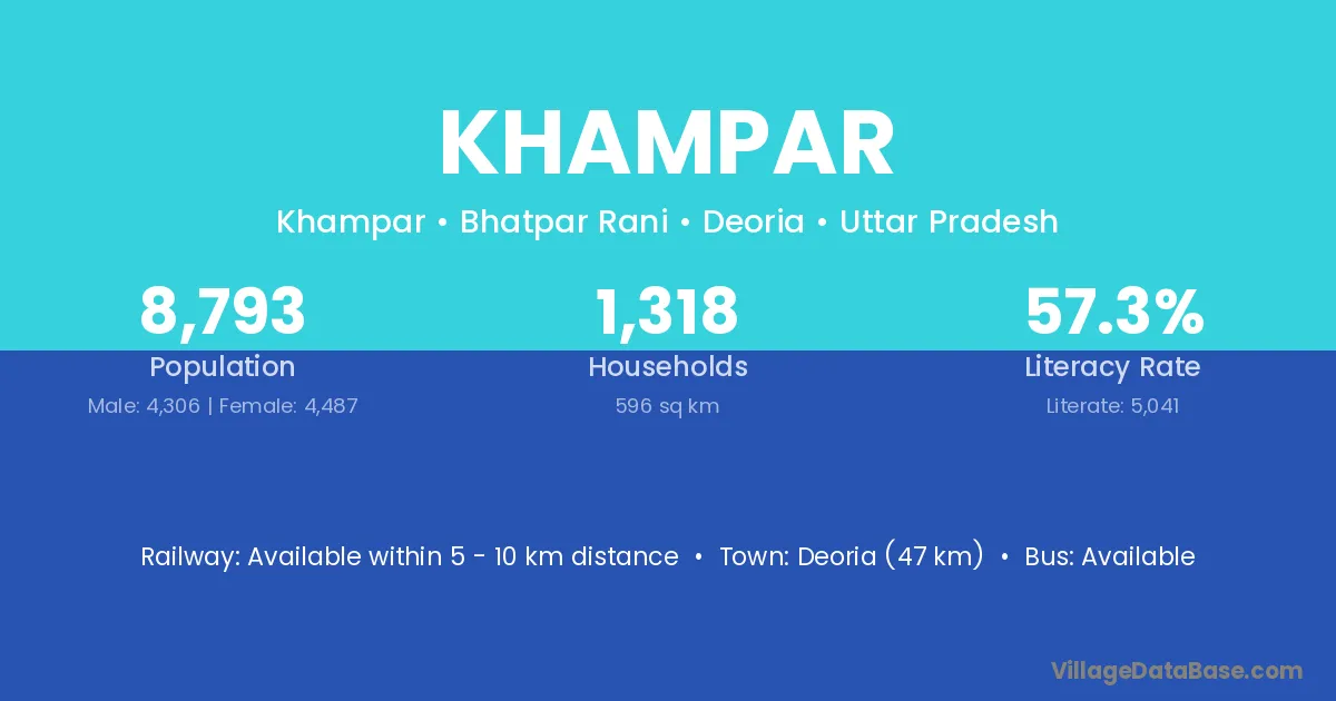 Deoria (47 km) is the nearest town to Khampar village for major economic activities and is located approximately 47 km away.