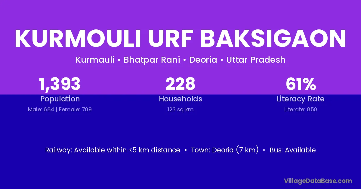 Kurmouli Urf Baksigaon village has a total population of 1,393 people, of which 684 are males and 709 are females.
