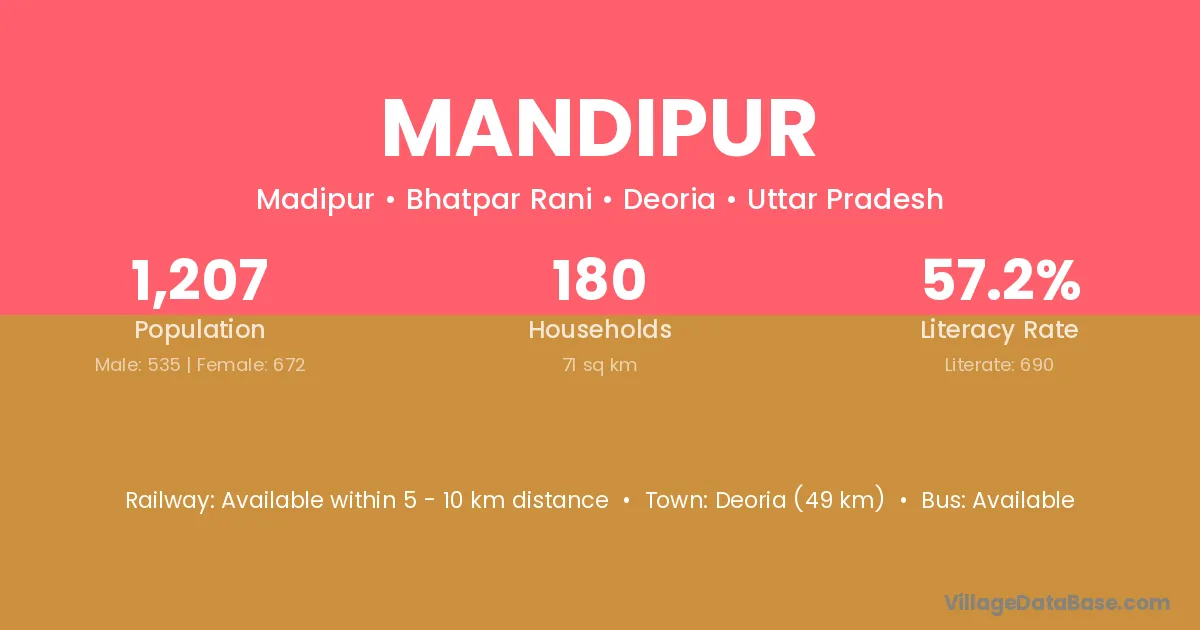Deoria (49 km) is the nearest town to Mandipur village for major economic activities and is located approximately 49 km away.