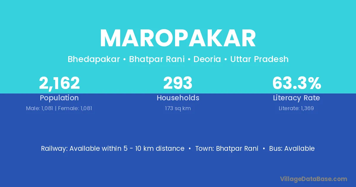 Maropakar village has a total population of 2,162 people, of which 1,081 are males and 1,081 are females.