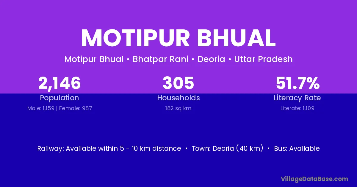Deoria (40 km) is the nearest town to Motipur Bhual village for major economic activities and is located approximately 40 km away.