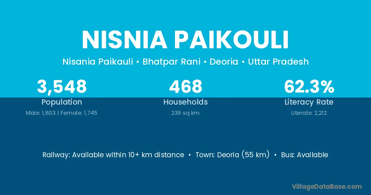 Deoria (55 km) is the nearest town to Nisnia Paikouli village for major economic activities and is located approximately 55 km away.