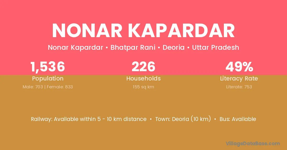 Deoria (10 km) is the nearest town to Nonar Kapardar village for major economic activities and is located approximately 10 km away.