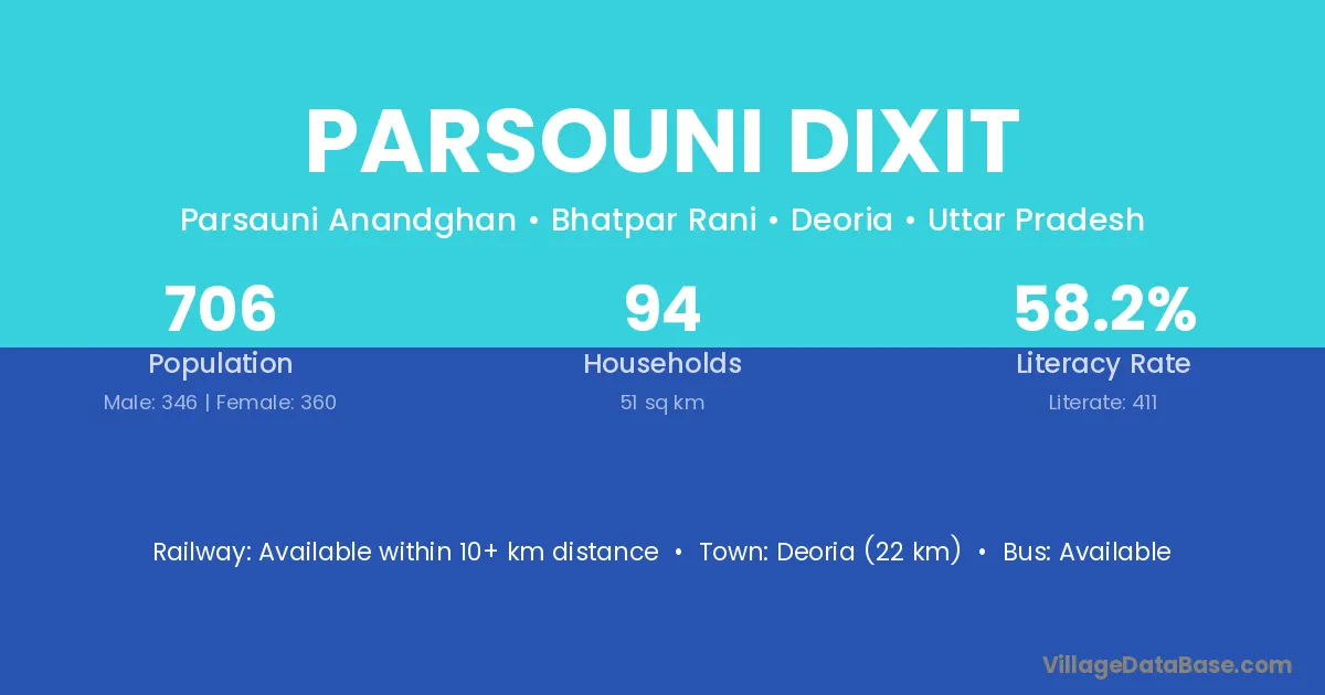 Deoria (22 km) is the nearest town to Parsouni Dixit village for major economic activities and is located approximately 22 km away.