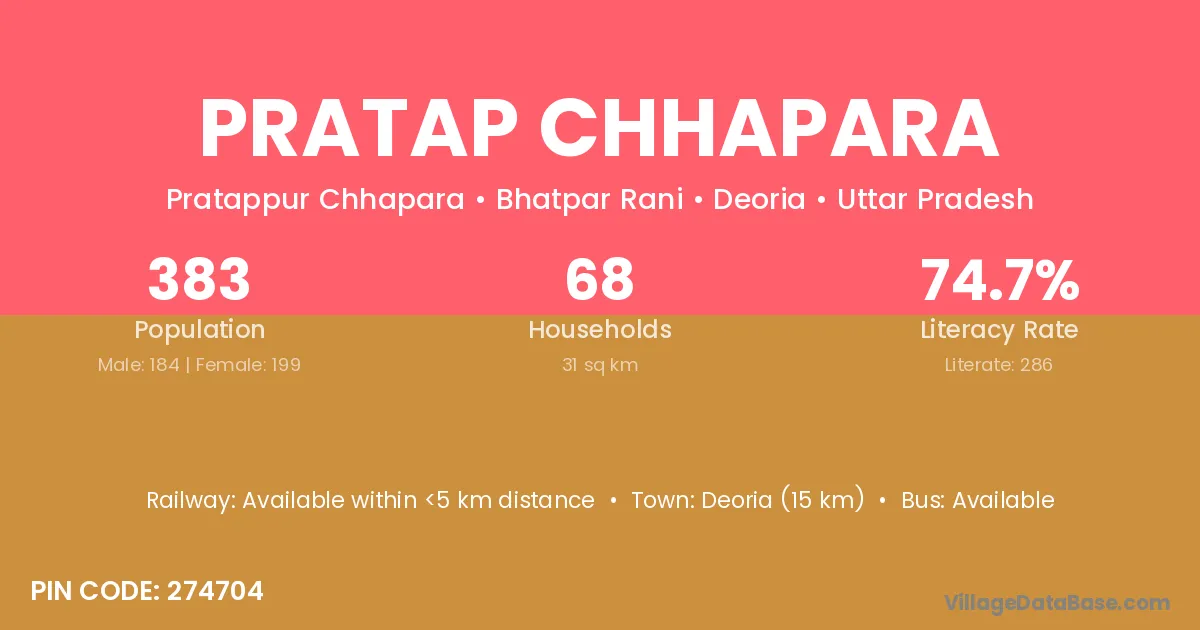 Deoria (15 km) is the nearest town to Pratap Chhapara village for major economic activities and is located approximately 15 km away.
