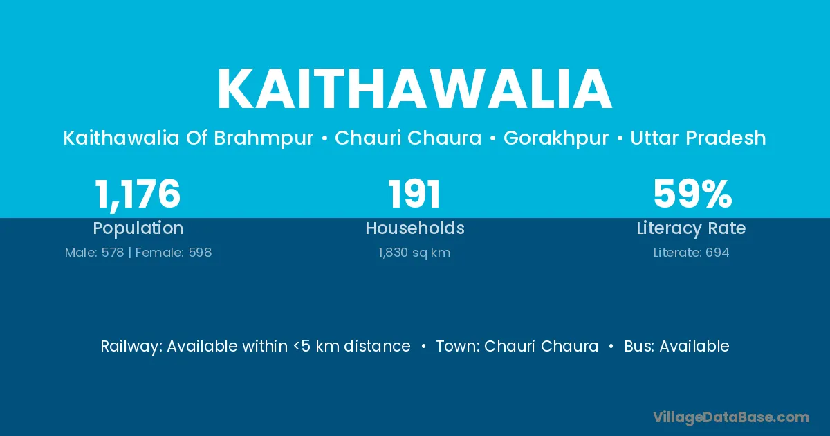 The literacy rate of Kaithawalia village is 59.09%. Male literacy stands at 70.17% and female literacy at 49.20%.
