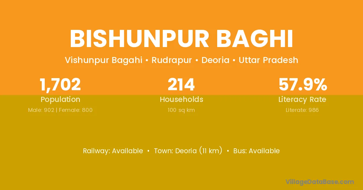 Deoria (11 km) is the nearest town to Bishunpur Baghi village for major economic activities and is located approximately 11 km away.