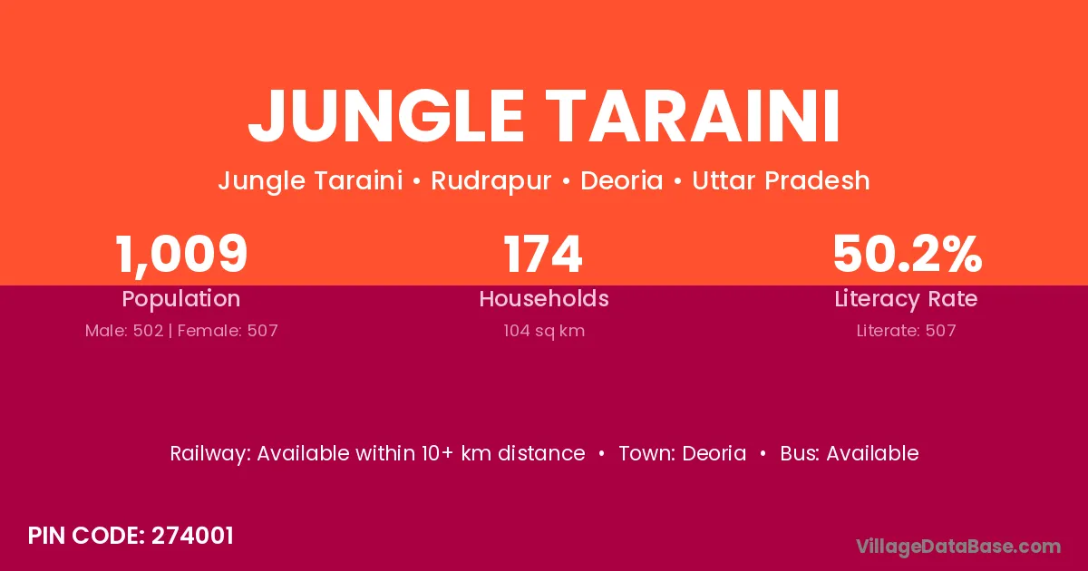 Jungle Taraini village has a total population of 1,009 people, of which 502 are males and 507 are females.