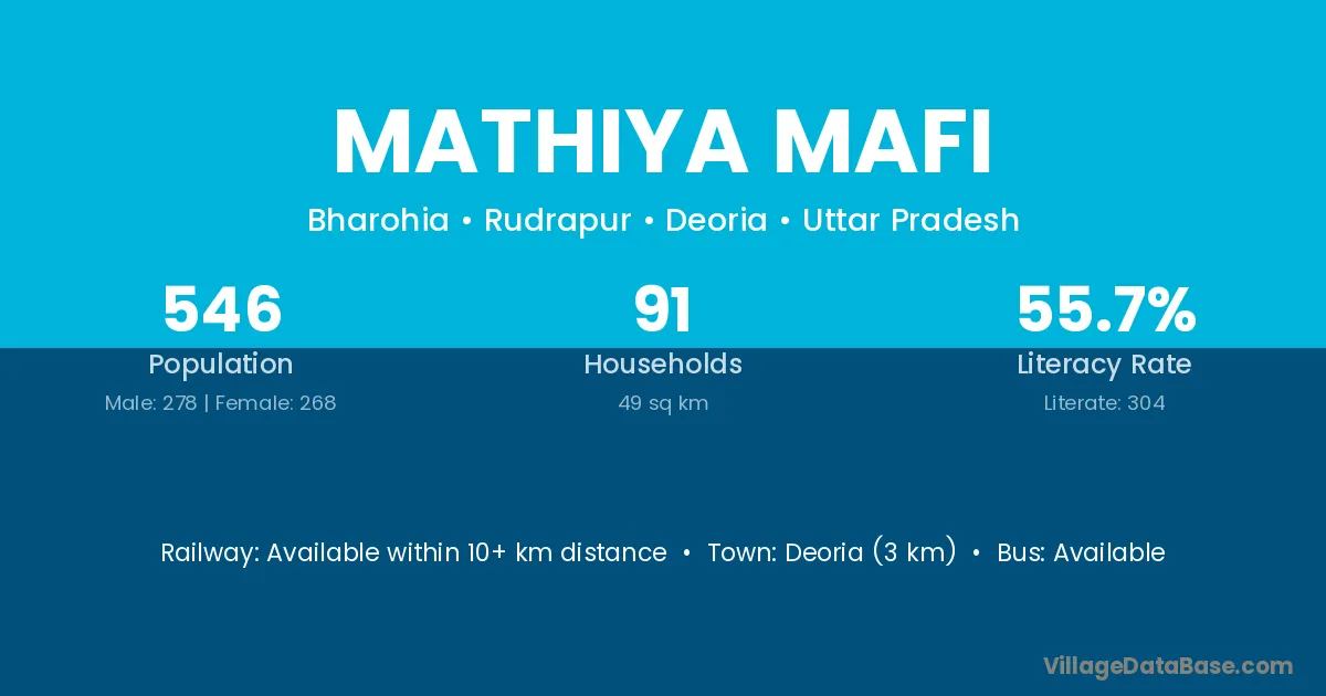 Deoria (3 km) is the nearest town to Mathiya Mafi village for major economic activities and is located approximately 3 km away.