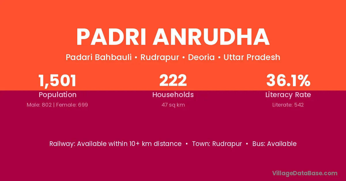 The literacy rate of Padri Anrudha village is 36.11%. Male literacy stands at 42.39% and female literacy at 28.90%.