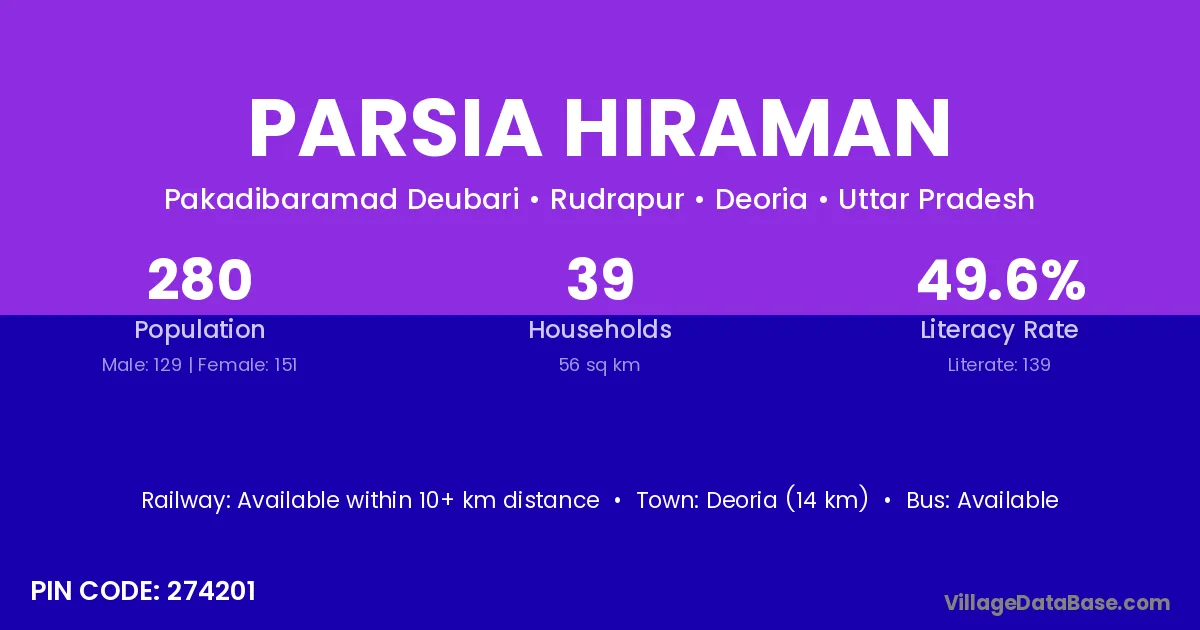 Deoria (14 km) is the nearest town to Parsia Hiraman village for major economic activities and is located approximately 14 km away.