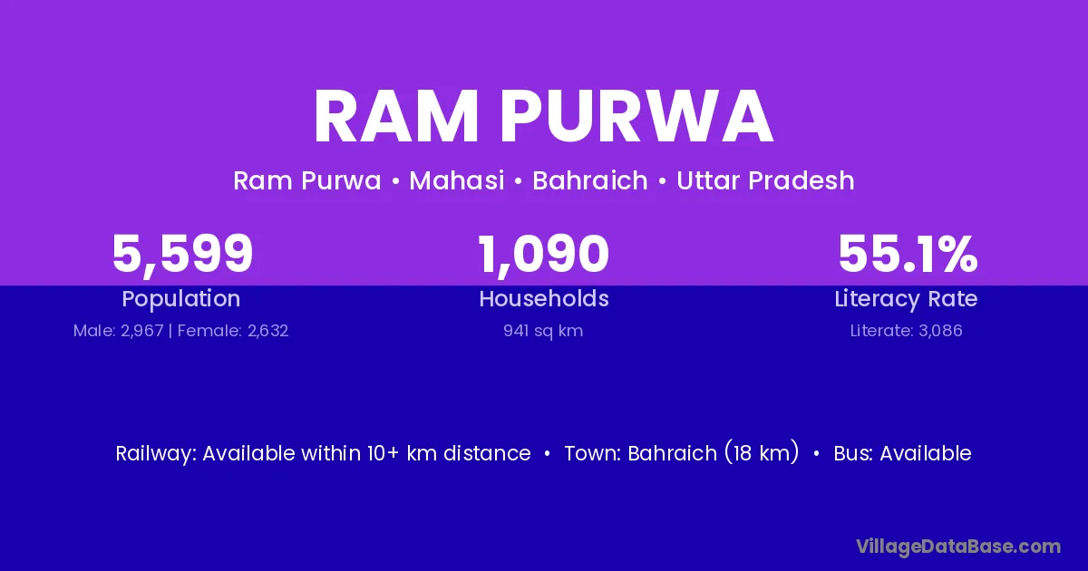 Ruddrpur (10 km) is the nearest town to Ram Purwa village for major economic activities and is located approximately 10 km away.