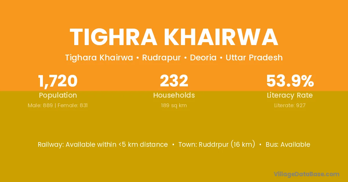 Ruddrpur (16 km) is the nearest town to Tighra Khairwa village for major economic activities and is located approximately 16 km away.