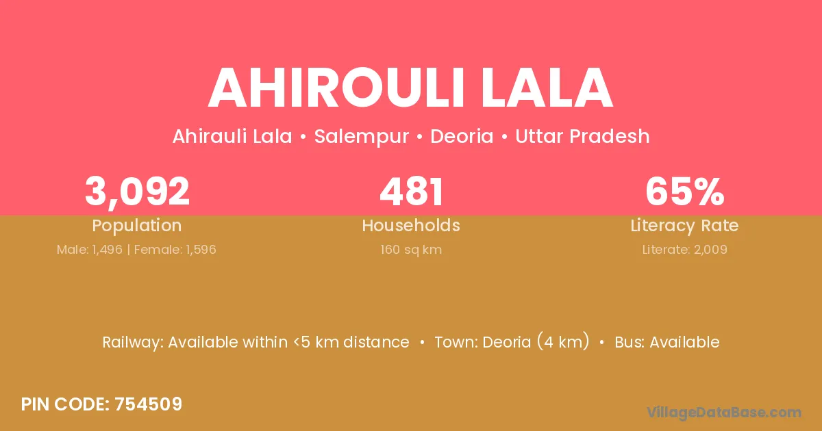 Deoria (4 km) is the nearest town to Ahirouli Lala village for major economic activities and is located approximately 4 km away.