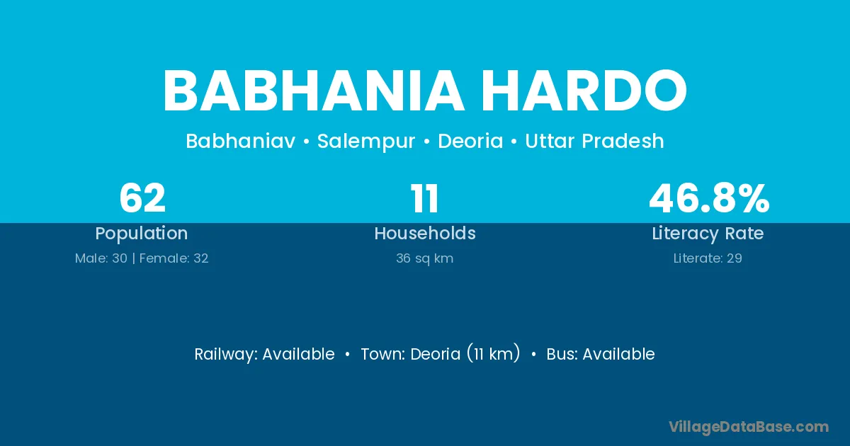 Deoria (11 km) is the nearest town to Babhania Hardo village for major economic activities and is located approximately 11 km away.